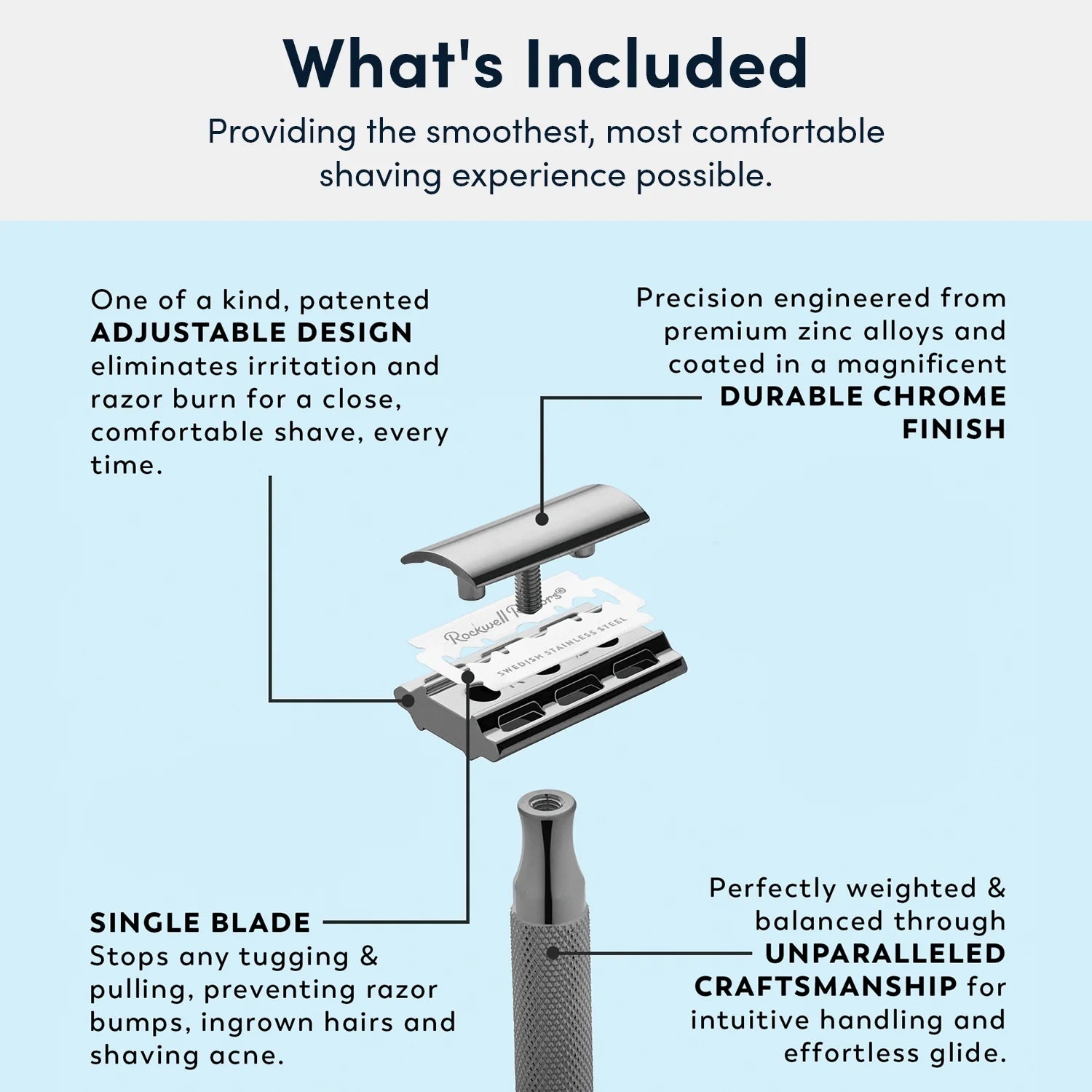 - Rockwellās innovative design eliminates shaving irritation and ingrown hairs FOR A CLOSE, COMFORTABLE SHAVE EVERY TIME.