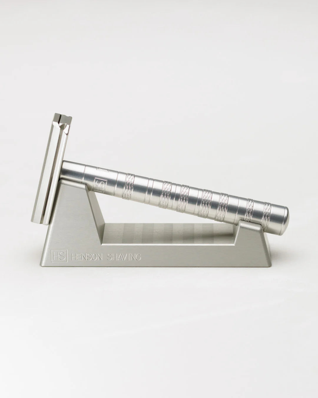 This stand is machined from 6061-T651 aluminum plate and is designed to fit your Henson razor perfectly. The razor will rest at an angle that allows for optimal drying between uses, so you can rest assured that your razor will always be in tip-top shape.
