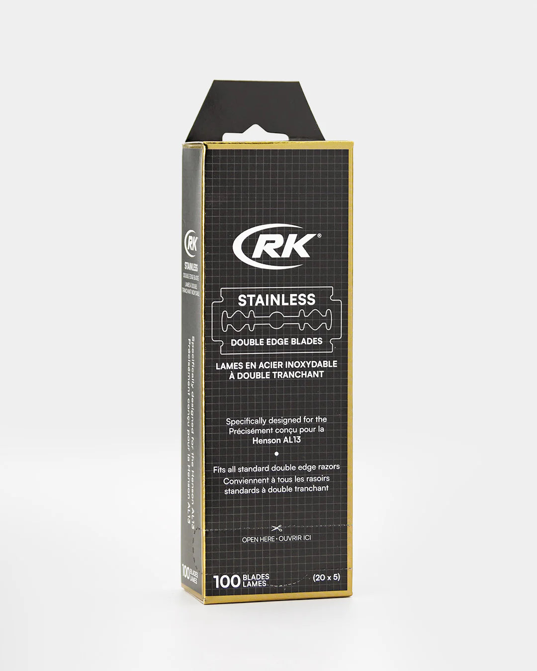 These stainless steel, double edge blades are specifically made to the dimensions of the Henson AL13. RK Shaving double-edged blades have an extremely high quality of manufacturing with consistent performance and sharpness that performs well when paired with the Henson AL13.