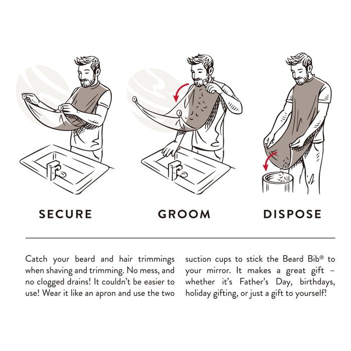 The Rockwell Beard Bib is an ingenious solution to an age-old grooming problem. This handy bib saves time and clean-up efforts by catching hair when shaving or trimming. No mess and no clogged drains. It couldn't be easier to use - just wear it like an apron and use the two suction cups to stick the Beard Bib to your mirror. Once you're done, just lower to a trash bin and release the hair!